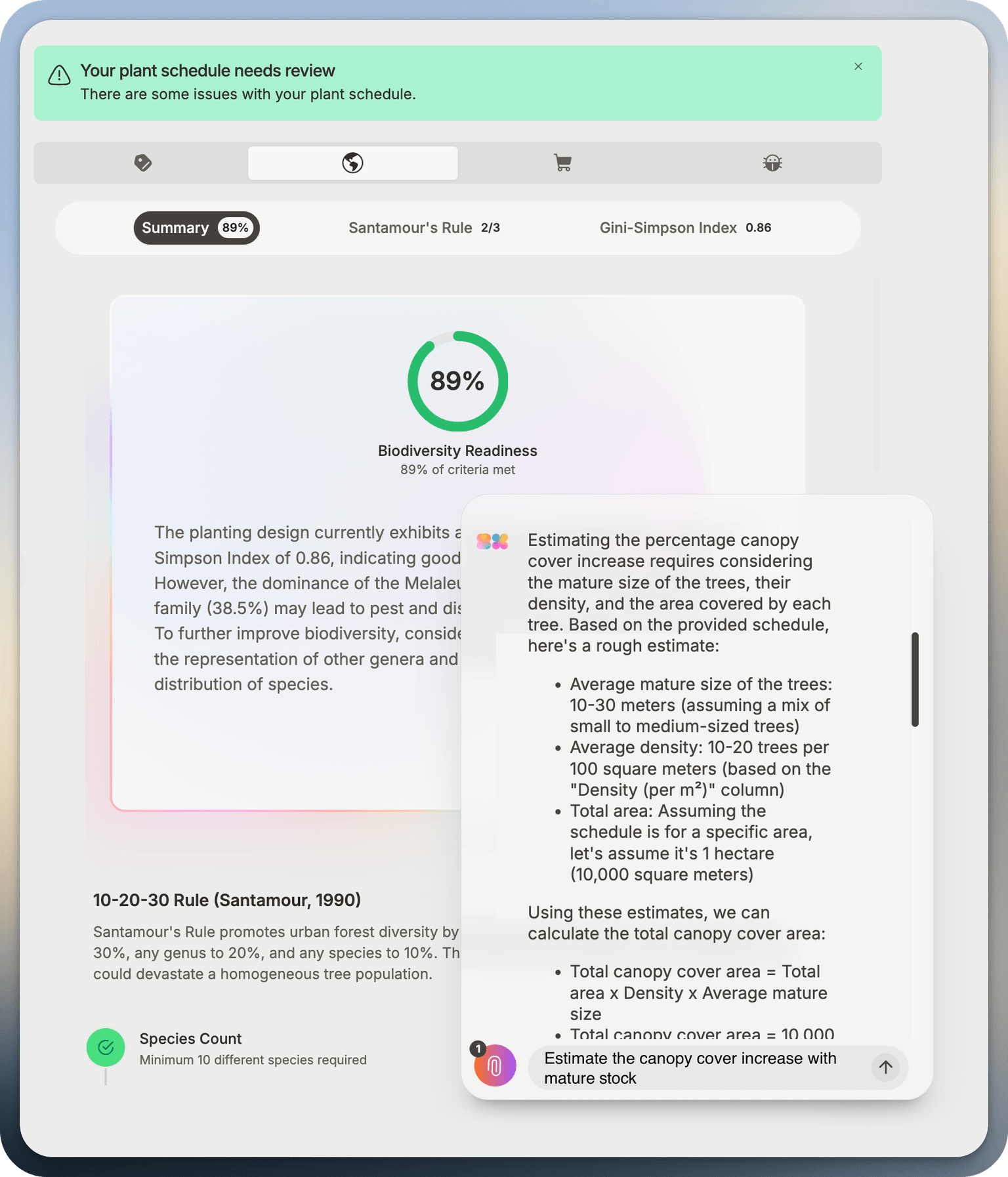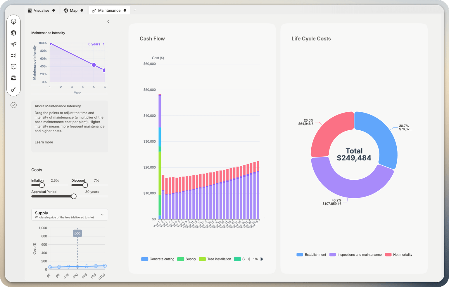 Easily compare trade-offs between mature/tubestock, cost, mortality and maintenance of your entire plant list